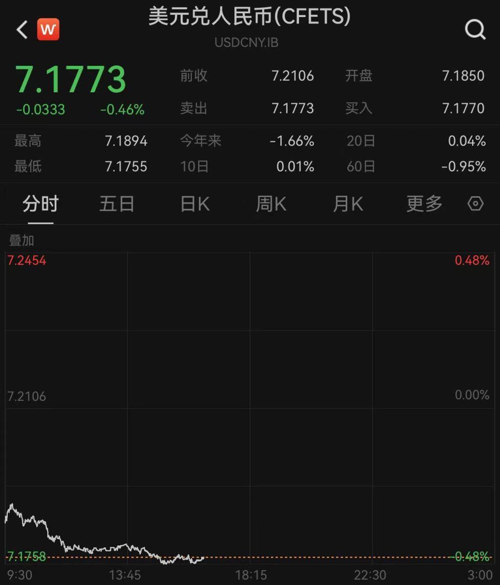 8月4日,人民币对美元即期汇率大涨超300点,截至发稿盘中最高升至7.1755,16时30分收于7.1766,较上一交易日上涨340个基点,这一升幅创下5月6日以来的最大值。